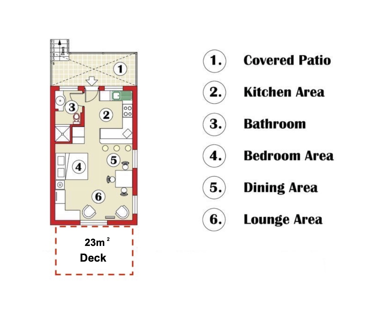 Oak Tree is a cosy 40 sq. m comfortably furnished cottage for 2 people with private entrance, 1 bedroom, 1 bathroom and 1 fully equipped kitchen. It is situated in the main Estate area next to the tennis court and only a short walk to the Rock Pool. The 10 sq. m covered terrace offers space and privacy.