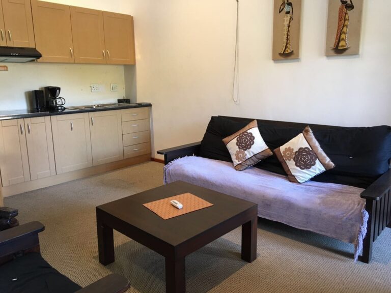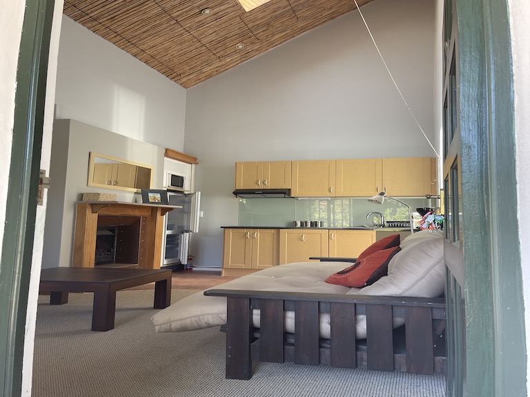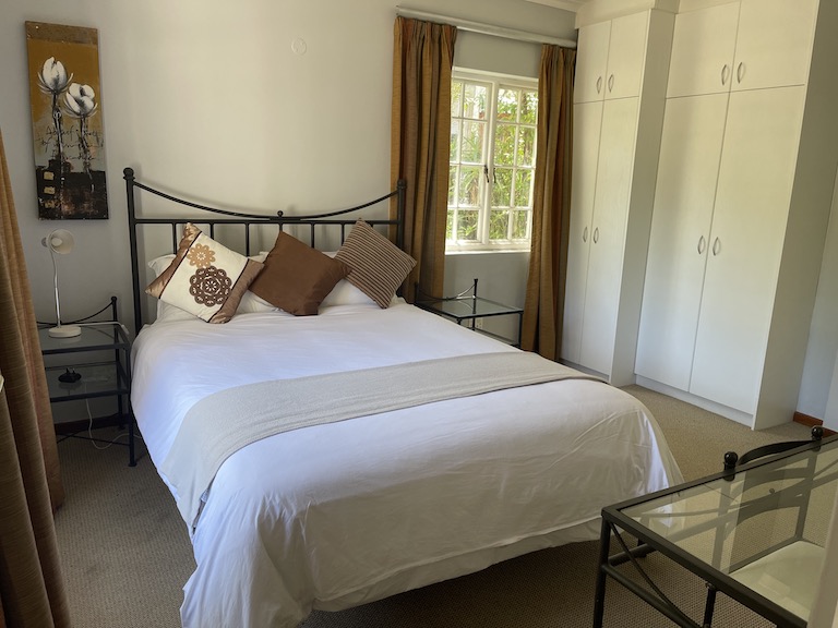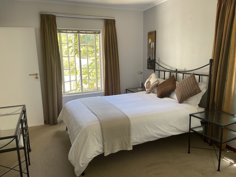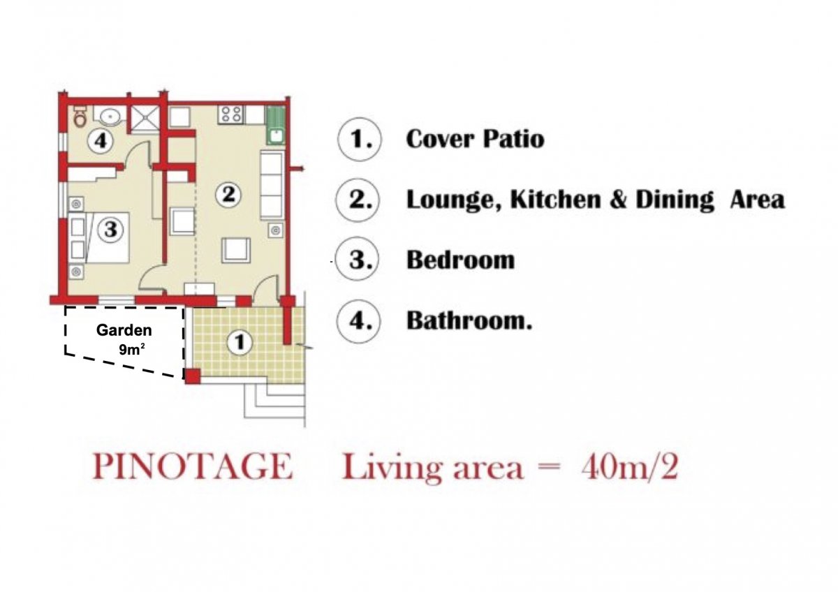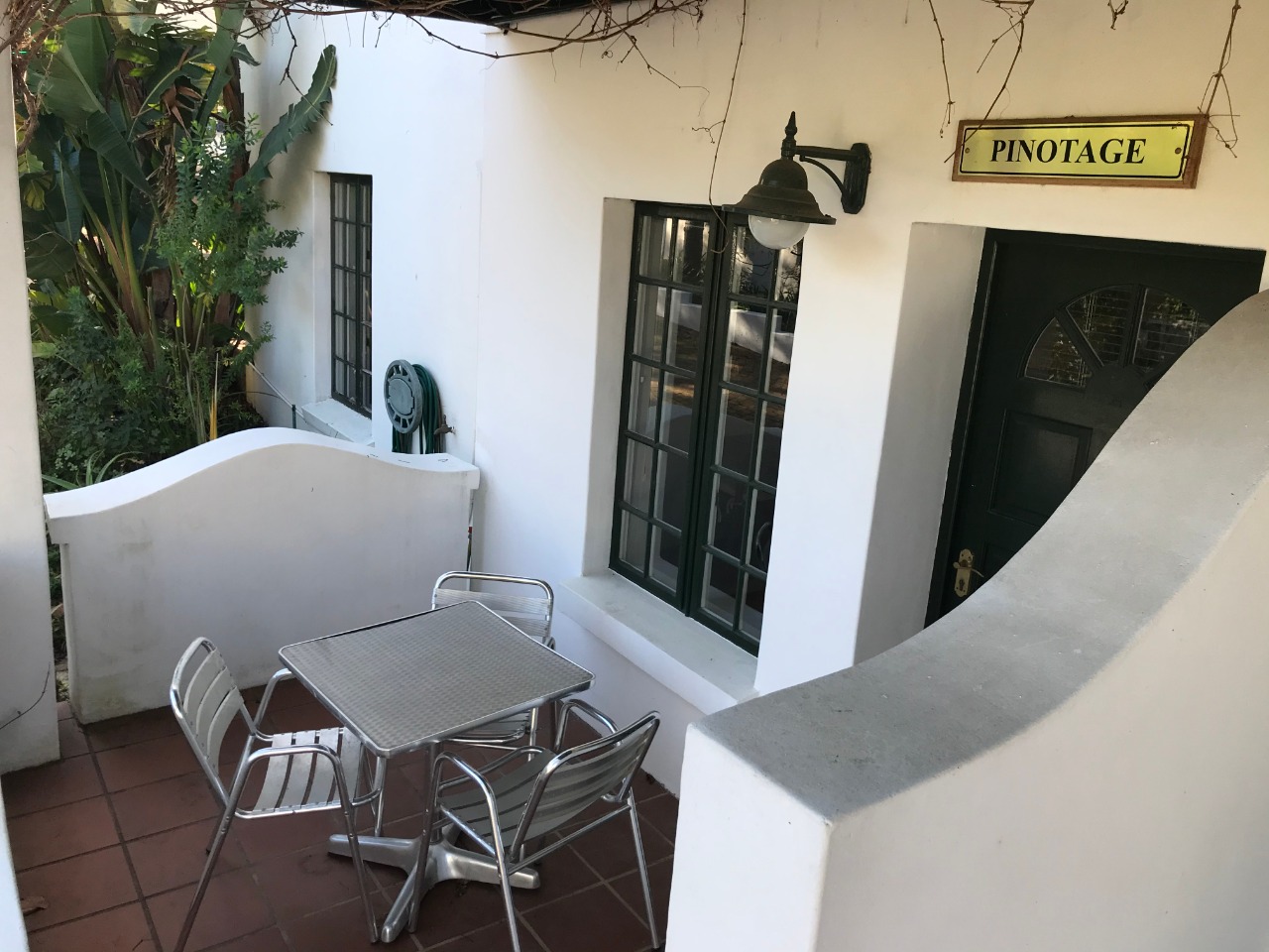 Pinotage is a 40 sq. m apartment with a kitchenette, living room, separate bedroom, en suite bathroom and 10 sq. m covered terrace. The living area leads out onto a vine trellised patio, aptly giving the name Pinotage and is a reflection of the wine region. It is one of two identical units that make up a beautiful Cape Dutch house. They are situated in the main Estate area and overlook the front of the Estate. A sleeper couch is available for an extra adult or 2 small children.